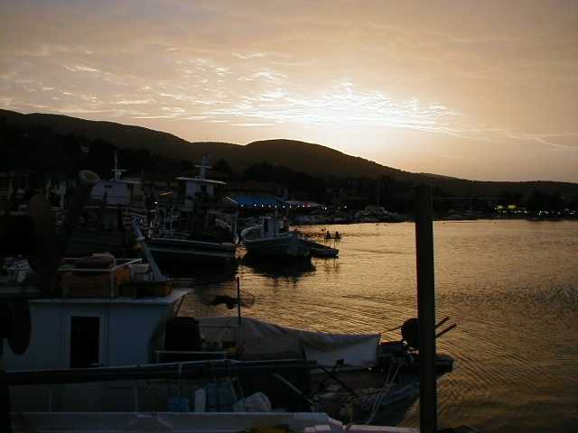 Nachdem wir in Phiskardo zum auslaufen bereit waren, konnten wir uns auch über etwas Wind freuen. Unser Tagesziel für den Dienstag war Levkada auf Levkas. Da starker auflandiger Wind bei unserer Ankunft in Levkada herrschte, erschien es uns sicherer, zurück zum Fischerhafen Lygia zu fahren. Insgesamt legten wir 28 Seemeilen zurück. Hier in Lygia war das Anlegen wesentlich sicherer, außerdem versprachen wir uns im Schutz der Berge eine ruhigere Nacht. Vom Wetter her hatten wir recht. Aber um kurz nach 5 Uhr ging das Treiben im Hafen los. Als die Fischerboote vom Fischfang zurück kamen, war es mit der Nachtruhe vorbei. Was solls, es war schon interessant, was hier los war. |