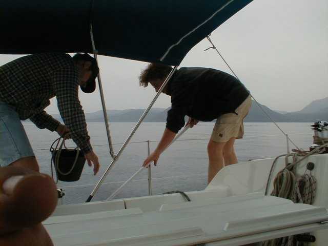 Die letzten 18 Seemeilen unseres Törns legten wir am Freitag von Valtou zur Marina Govia auf Korfu zurück. Nachdem wir das Schiff aufgetankt hatten, lagen wir pünktlich um 16 Uhr bei Sun Charter am Hafenkai. Die Schiffsübergabe war ohne Probleme. Da wir am nächsten Morgen bis ca. 8:30 Uhr die Yacht verlassen mußten, wurde schon mal mit dem Packen angefangen, und alles was nicht mehr gebraucht wurde, wurde entsorgt. |